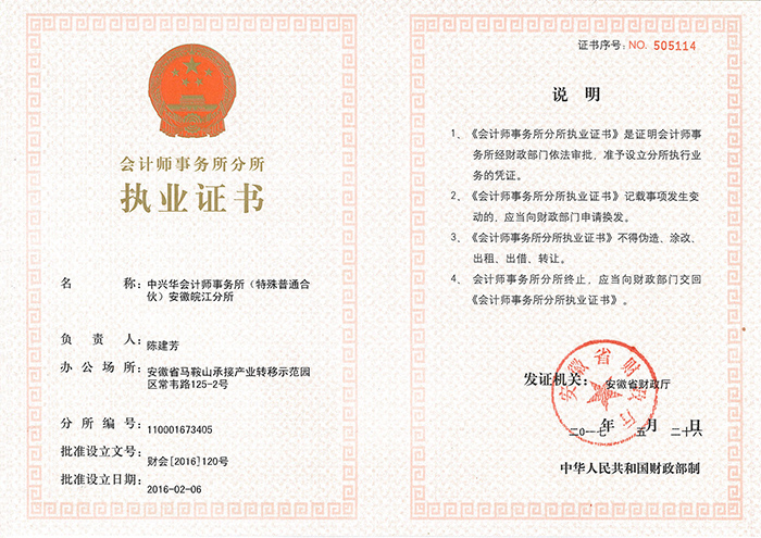 中兴华皖江分所执业证书
